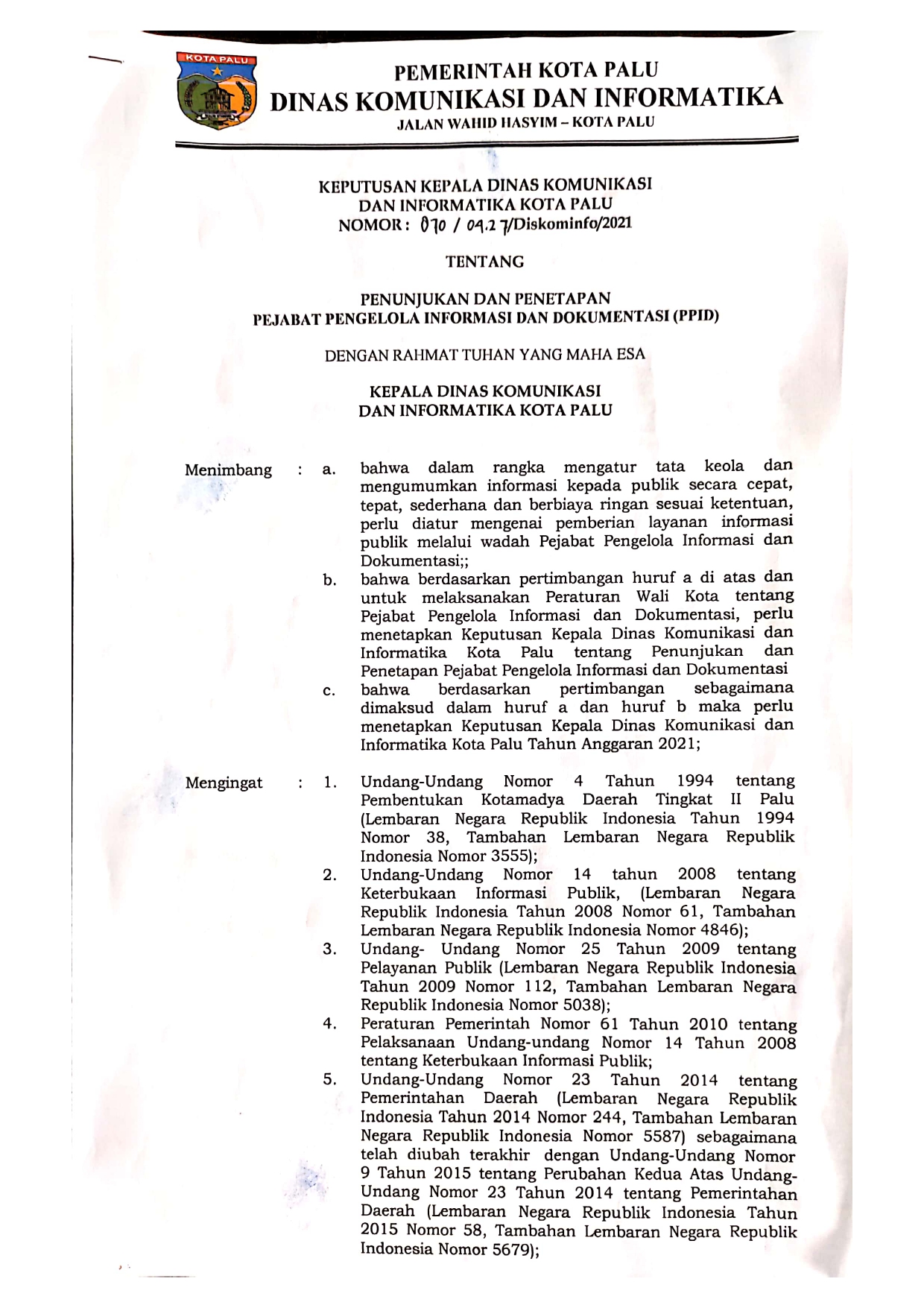 Palu, Kamis 14 Oktober 2021 Kepala Dinas Komunikasi dan Informatika Kota Palu dalam hal ini diwakili Kepala Bidang Informasi dan Komunikasi Publik Weni Peryanti melaksanakan monitoring Kelompok Informasi Masyarakat (KIM) di Kecamatan Palu Selatan. Pertemuan yang berlangsung di ruang Rapat Kantor Kecamatan Palu Selatan diikuti oleh beberapa pengurus KIM Ananda Palu Selatan didampingi pihak Kec. Palu Selatan yang diwakili oleh Kepala Seksi Pemerintahan Masriah. Berdasarkan Peraturan Menteri Komunikasi dan Informatika RI No. 08/PER/M.KOMINFO/6/2010 tentang Pedoman Pengembangan dan Pemberdayaan Lembaga Komunikasi Sosial, tanggal 1 Juni 2010, Kelompok Informasi Masyarakat dibentuk sebagai kelompok yang secara mandiri dan kreatif melakukan pemberdayaan masyarakat terhadap akses informasi dan komunikasi, dari masyarakat oleh masyarakat dan untuk masyarakat dengan pendampingan dari Pemerintah Kota Palu melalui Diskominfo Kota Palu dan dukungan pihak Pemerintah Kecamatan dan Kelurahan. Kepengurusan KIM Ananda Kec. Palu Selatan menjadi yang pertama terbentuk di Tahun 2021 untuk Kota Palu dan secara resmi disahkan dengan Surat Keputusan Camat Palu Selatan Gunawan. Keaktifan kepengurusan KIM dan terlaksananya kegiatan-kegiatan KIM menjadi tugas Pemerintah agar dapat mewujudkan mayarakat yang informatif, cerdas, produktif dan dapat mengatasi persoalan bersama melalui akses dan pemberdayaan informasi.