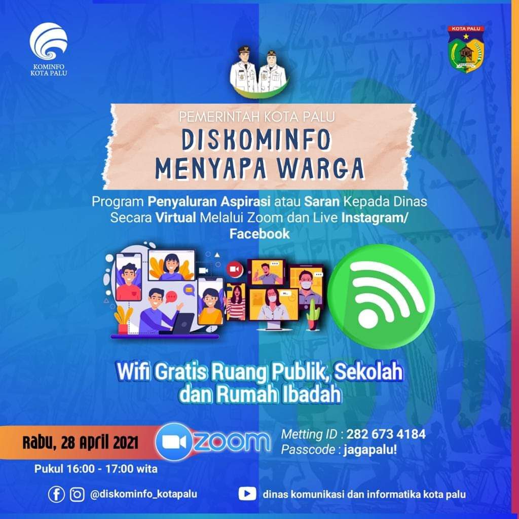 Hari ini, Rabu, 28 April 2021 Pukul 16.00 – 17.00 WITA Dinas Komunikasi dan Informatika Kota Palu ikut serta dalam Program penyaluran aspirasi dan saran kepada dinas secara virtual melalui aplikasi zoom meeting yang juga disiarkan secara live di Facebook dan Youtube Dinas Komunikasi dan Informatika Kota Palu.